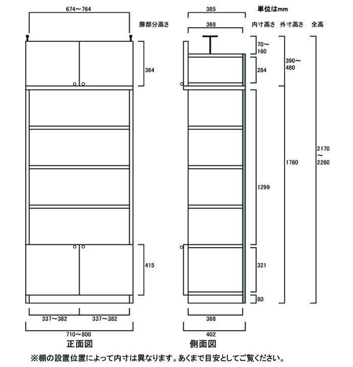 地震対策奥深下扉付書庫 お客様組み立て 商品仕様 ■タイプ: タフ棚板(棚板厚さ2.5cm)タイプ ■棚板耐荷重: 30kg ■外寸: 奥行40cm×高さ217〜226cm×幅71〜80cm (幅は1cm単位でオーダーできます) ■対応天井高:(2m17cm〜2m26cm) 217cm 218cm 219cm 220cm 221cm 222cm 223cm 224cm 225cm 226cm 伸縮式のつっぱり金具で高さ2cm17cm〜2m26cmの天井に対応します (2m17cm 2m18cm 2m19cm 2m20cm 2m21cm 2m22cm 2m23cm 2m24cm 2m25cm 2m26cm) ■外寸(幅): 71cm 72cm 73cm 74cm 75cm 76cm 77cm 78cm 79cm 80cm ■棚板枚数 移動固定棚板:6 ■構成:本体…奥行40cm×高さ178cm×幅71〜80cm 突っ張り棚…奥行40cm×高さ32cm×幅71〜80cm 本体用扉…高さ41.5cm×幅71〜80cm 突っ張り棚用扉…高さ36.4cm×幅71〜80cm オーダー 奥深下扉付書庫_ 商品詳細 本体 + 突っ張り棚 + 本体用扉 + 突っ張り棚用扉のセットです。
