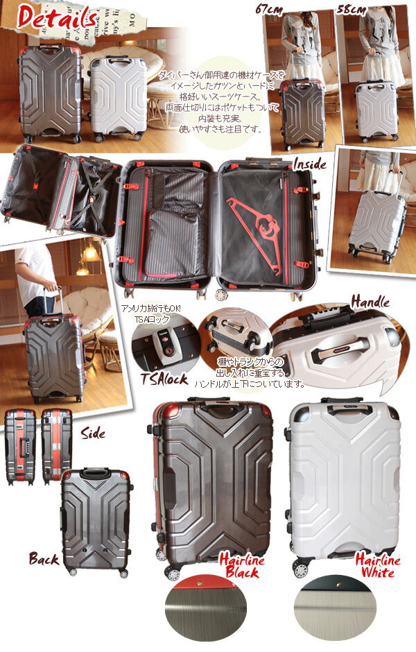 ■サイズ :多少の誤差がございます H67(77)×W46(51)×D28(29)cm ※( )内は外寸 ■容 量 : 約83リッター ■重 量 : 5.6kg ■素 材 : ABS+ポリカーボネイト■仕 様 : 引き手内蔵(3段階調節) ■付 属 : TSAロック(鍵2本)、ハンガー1本※内装はどちらのカラーもブラックのストライプ生地にレッドの縁取りです♪